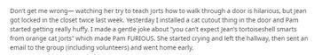 但Jean上周又被Jorts锁在壁橱里两次,于是昨天我在门上开了个猫洞。