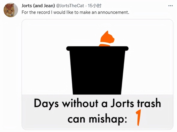 “宣布一件事:Jorts没有翻垃圾桶的第一天!”