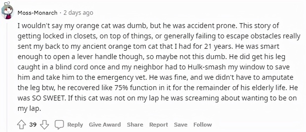 “我在猫猫救援队工作过……大橘可太笨了 !尤其是公的大橘(数量也最多)最笨!!”