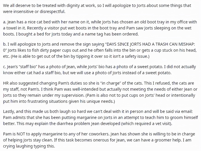 人力资源部还建议我,让她负责这些猫,但我拒绝了,猫是我的下属,不是Pam的。