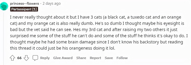 “我倒是从来没想过这个问题,但我有三只猫(一只黑猫,一只奶牛猫,一只橘猫),我家的橘猫也很笨。它可太笨了,我一开始以为它是视力不好,但医生说它能看见。