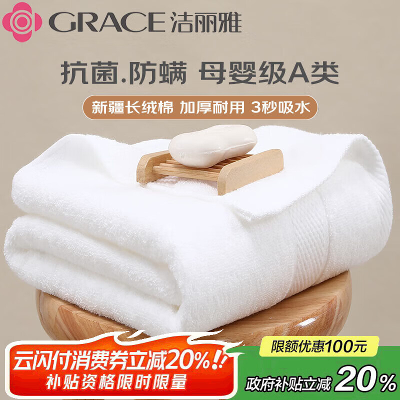 洁丽雅浴巾A类抗菌纯棉加厚五星级酒店吸水速干男女浴巾 140*70 白色