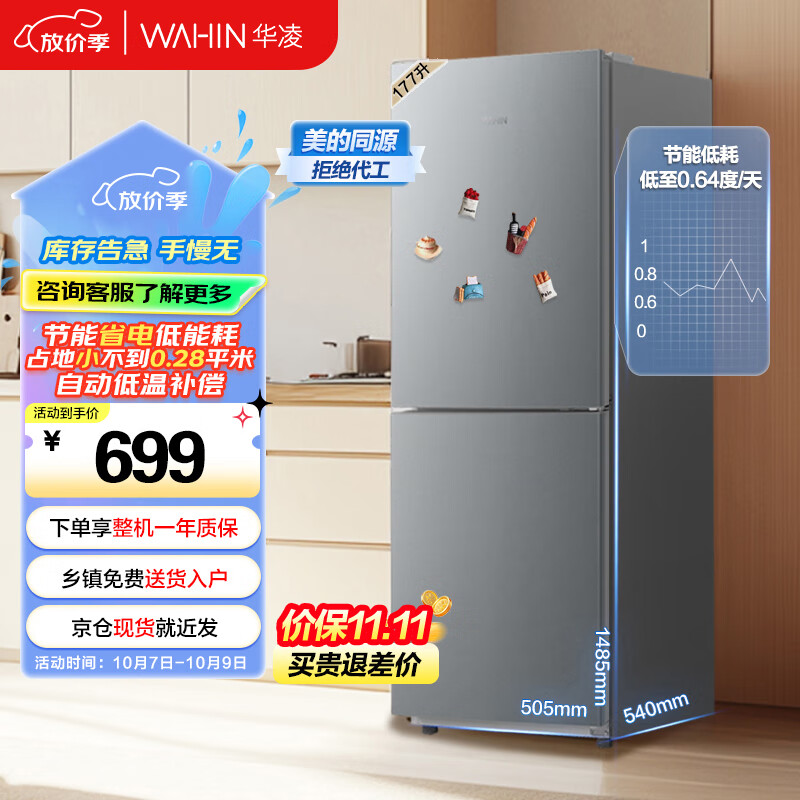 华凌185 美的出品双门两门家电冰箱小型家用出租房节能低音二门双温速冻冷冻冷藏小冰箱HR-185