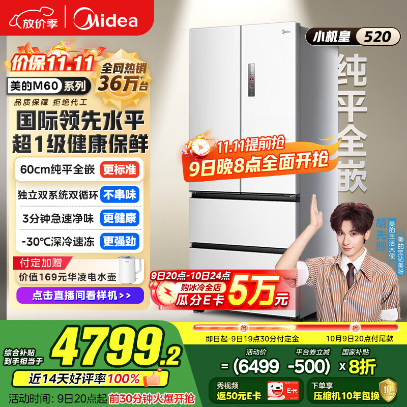 美的(Midea)M60系列520纯平全嵌法式多门四开门家用冰箱超薄双系统循环大容量无霜BCD-520WUFPZM(E)白国家补贴