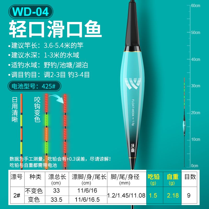 沃鼎夜光漂鱼漂浮漂咬钩变色清晰醒目高灵敏日夜两用野钓大物电子漂 WD-04【轻口滑鱼-2号】吃铅:1.5g 2支【不变色】日夜两用尾+8电池