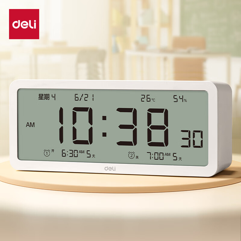 得力(deli)多功能电子闹钟 学生智能背光电子钟床头钟时钟大音量温湿度计 开学升学季必备礼物白色8827