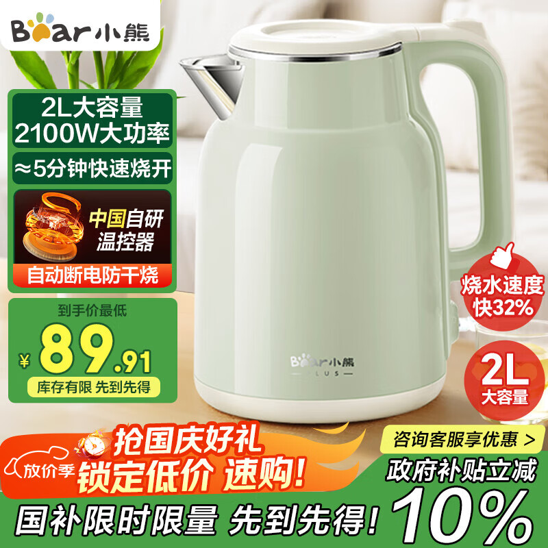 小熊(Bear)烧水壶 电热水壶 电水壶家用2L大容量 304不锈钢双层防烫2100W极速烧水 ZDH-F20H3