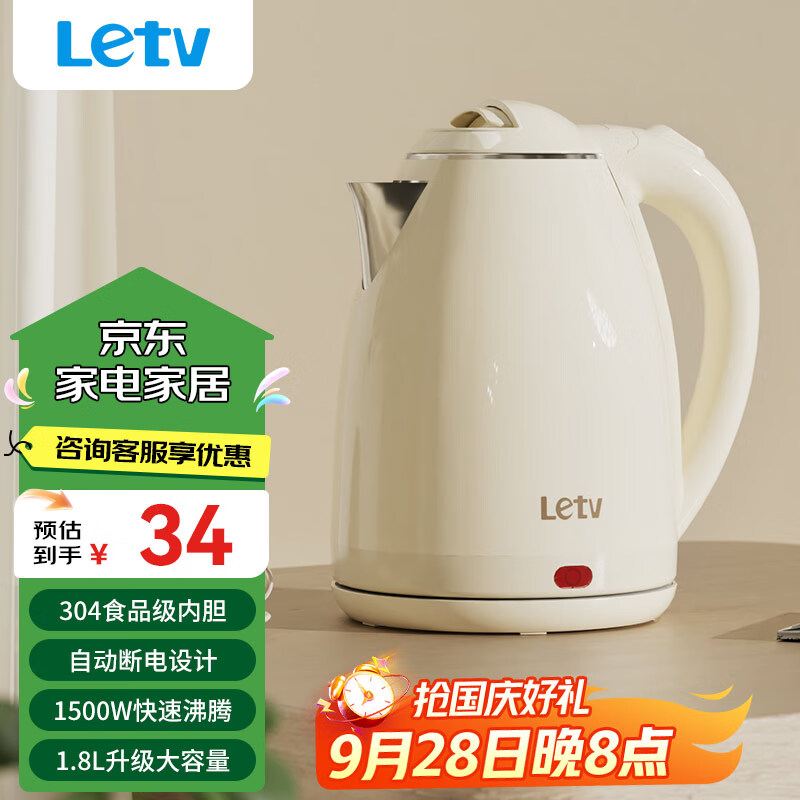 乐视电水壶热水壶大容量家用烧水壶304不锈钢双层酒店厨房电热水壶快速烧水器断电小电器电壶 1.8L