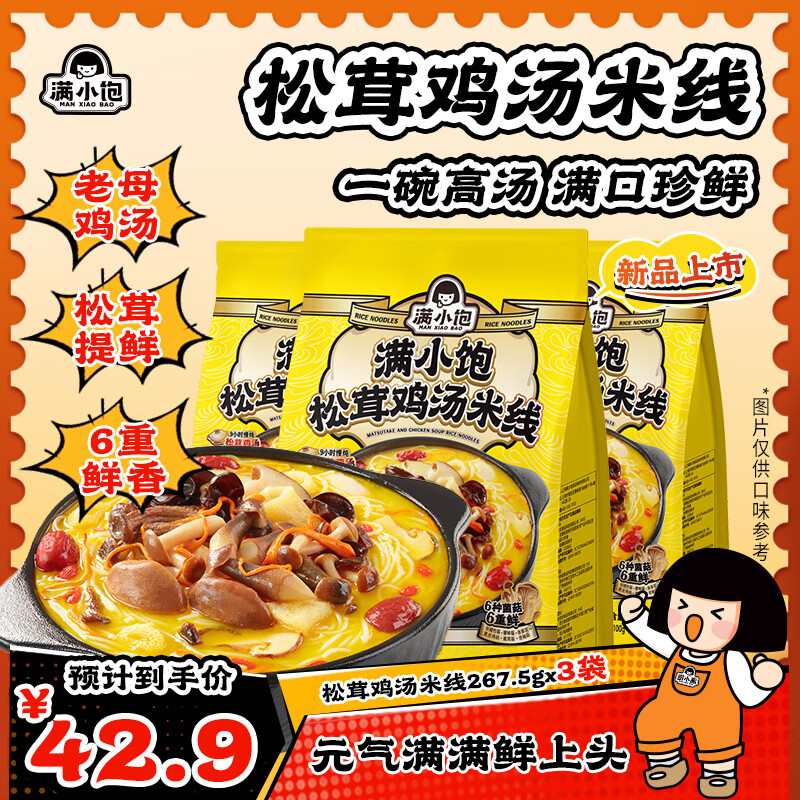 满小饱松茸鸡汤米线267.5g*3袋浓郁鲜香添加菌菇 速煮细米线方便速食