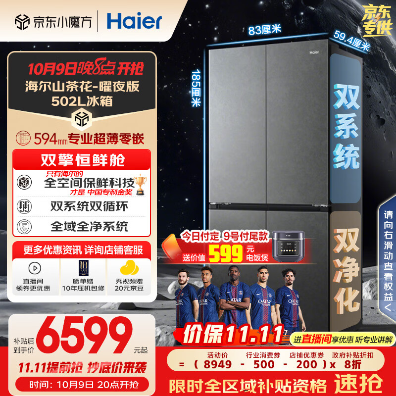 海尔(Haier)「山茶花-曜夜」502升双擎恒鲜舱双系统全空间保鲜594mm超薄零嵌十字冰箱BCD-502WGHTD1CYXU1