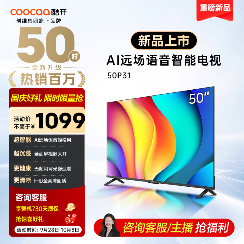 酷开创维 P31系列 50英寸电视 全高清 超薄全面屏 节能护眼智能平板游戏液晶电视机以旧换新50P31