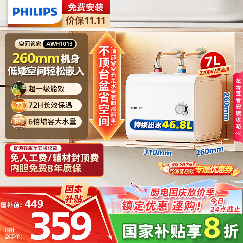 飞利浦(PHILIPS)7升上出水小厨宝电热水器 2200W家用厨房速热 一级能效节能国家补贴20% AWH1013/93(070UA)
