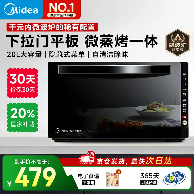 美的变频微波炉烤箱一体机 光波炉智能家用平板 800W大功率速热 一级能效下拉门国家补贴20L M3-208E 微蒸烤一体机