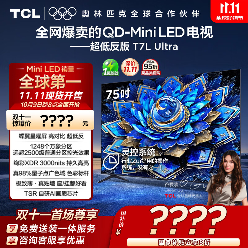 TCL电视 75T7L Ultra 75英寸 QD-Mini LED 蝶翼星曜屏 万象分区 绚彩XDR 3000nits 超薄 国家补贴 T7L