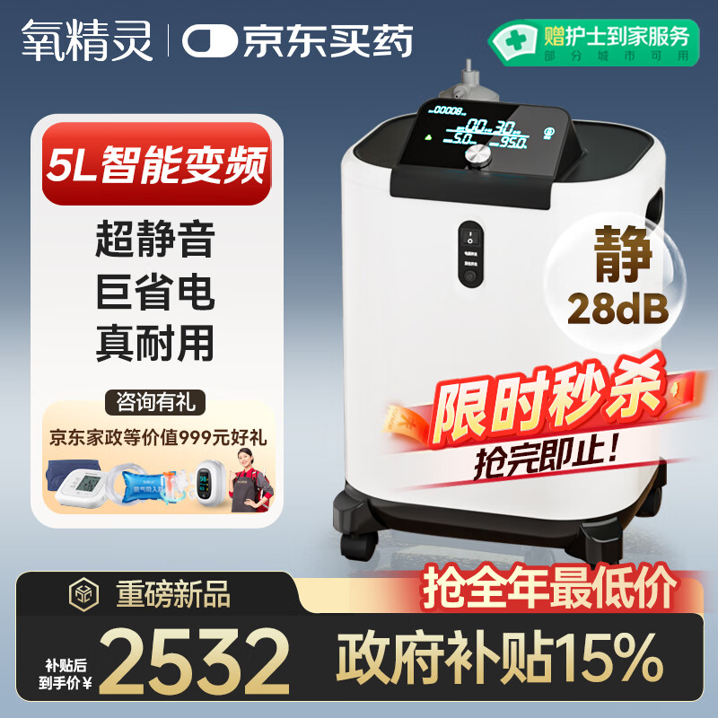 氧精灵5L升医用级超静音直流变频制氧机带雾化家用老人孕妇吸氧气机国补