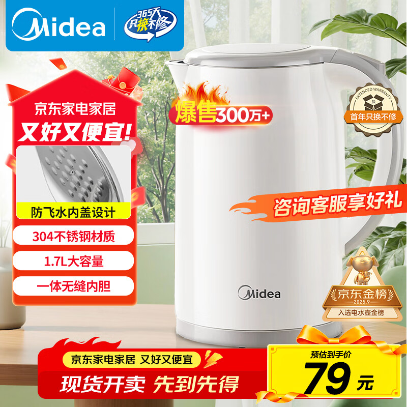 美的(Midea)电热水壶家用烧水壶煮水壶 食品级304不锈钢 1.7升0涂层无缝内胆开水壶 MK-SH17M301