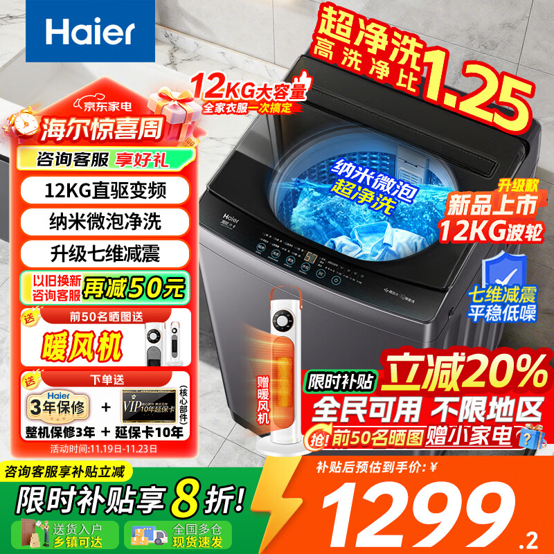 海尔(Haier)洗衣机全自动10公斤/12公斤直驱变频波轮家用洗衣机一级能效大容量AI智洗电离除菌 家电补贴20% 【新品12公斤】直驱+超净洗+纳米微泡净+七维减震